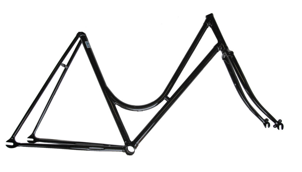 The Frascona curve instead carries that load through a single continuous structural member. The curve creates a direct path between the head tube and the bottom bracket, allowing the primary forces of steering and pedalling to travel through one uninterrupted tube.